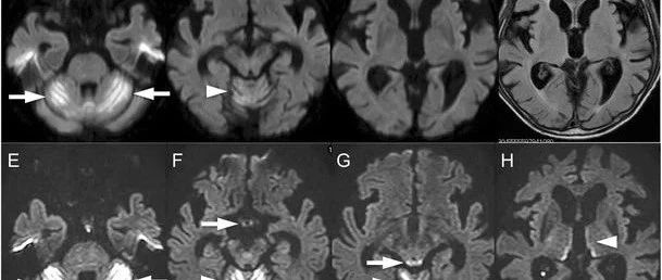 73岁男性,表现为进行性共济失调步态3周。其有3年的多发性骨髓瘤病史,接受了2年的化疗。1月前开始来那度胺(lenalidomide)治疗,出现过化疗相关的恶心和呕吐。否认习惯性饮酒史。MRI可见小脑半球和蚓部DW高信号病变(图1a-c)。FLAIR序列可见额叶和颞叶皮质萎缩,但幕上脑实质未发现异常病变(图1d)。患者从当地医院转来,主要表现为明显的平衡障碍,无法站立。神经系统查体提示双侧侧向凝视麻痹,双侧水平方向眼球震颤,深腱反射减退,共济失调性构音障碍和小脑性共济失调。在第一次MRI检查后两天,复查DWI可见小脑半球和蚓部,乳头,中脑顶盖和丘脑内侧病变(图1e-h)。患者小脑病变先于其他病变出现。FLAIR在相同区域也可见异常,增强后可见顶盖病变强化。脑脊液生化等结果正常。...