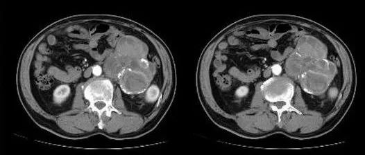 医学影像 yxyx-app 医学影像APP,打造伴随医生快速成长的影像学习社区。与影像园(Xctmr.com)一起提供最全面的影像案例库、基础(解剖、病理、影像诊断)知识、影像技术及考题等,为医生提供最佳的医学影像参考。【所属科室】普外科【基本资料】患者,男,61岁【主诉】腹部外伤一天【影像图片】【讨论问题】如何诊断?【医学影像APP用户讨论】评论:左肾前方巨大肿块,边缘不规则,可见分叶,内部密度欠均匀,有结节状、线状、环形钙化及囊性密度减低区,病灶与胰腺体部关系较密切,左侧肾静脉显示不清,左肾腹部肠管受推压向前移位,左肾受压改变。增强扫描病变可见不均匀异常对比强化。诊断:1.神经源性肿瘤,副节瘤可能大;2. 无功能嗜铬细胞瘤。...
