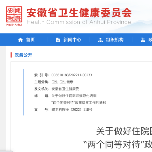 导读经住培合格的新参加工作的大学本科毕业生,在明确岗位前,参照专业学位硕士研究生的初期工资标准执行。近日,安徽省卫生健康委会同省公安厅、省人力资源社会保障厅、省中医药局联合印发《关于做好住院医师规范化培训“两个同等对待”政策落实工作的通知》(皖卫科教秘〔2022〕118号,以下简称《通知》),从保护平等就业权益、保证同等薪酬待遇、保障职业发展权益、做好政策衔接等方面进一步健全我省住院医师规范化培训制度,保障住院医师合理待遇,增强住院医师获得感。...