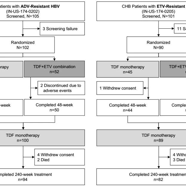 对于恩替卡韦(ETV)和/或阿德福韦(ADV)耐药的HBV感染者,替诺福韦酯(TDF)单药治疗相比TDF联合ETV治疗在既往研究中表现出非劣效性。但是病毒学应答率在长达144周的TDF单药治疗中并不理想,且长期安全性尚不确定。