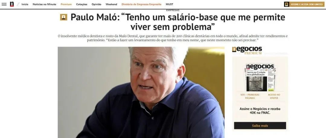 Paulo Maló 自 10 月 4 日以来一直资不抵债。葡萄牙语报道:Paulo Maló: “Tenho um salário-base que me permite viver sem problema”O insolvente médico dentista e rosto da Malo Dental, que garante ter mais de 200 clínicas dentárias em todo o mundo, afinal admite ter rendimentos e património. “Estão a fazer um levantamento do que tenho em meu nome, que neste momento não sei precisar.”...