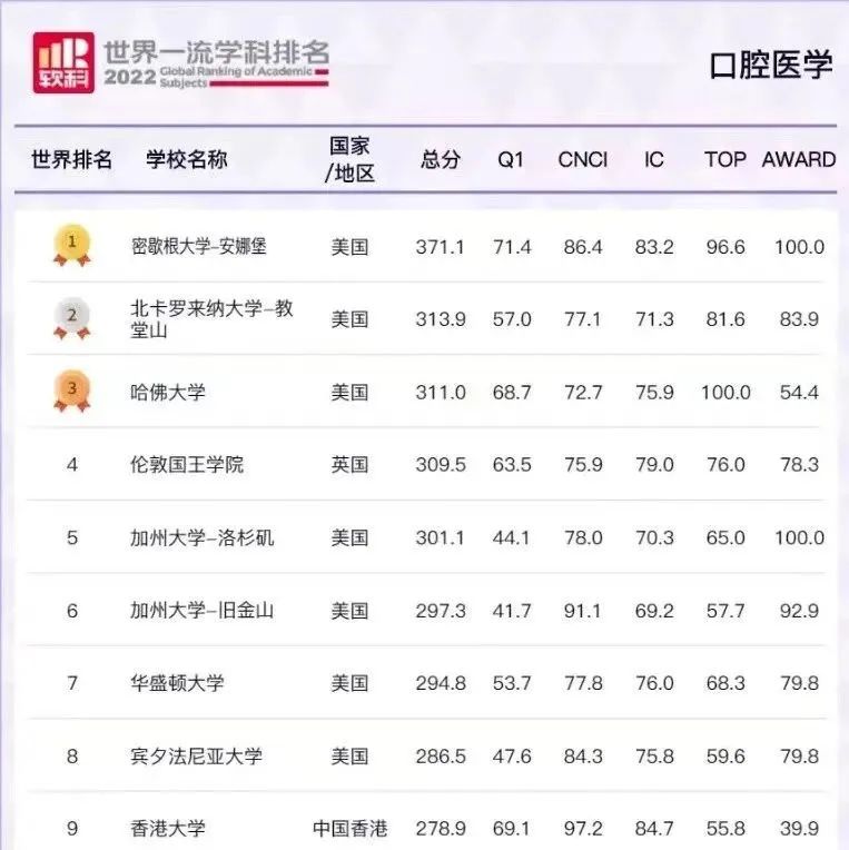 2022年7月19日,高等教育评价专业机构软科正式发布2022“软科世界一流学科排名”(ShanghaiRanking's Global Ranking of Academic Subjects),2022年排名覆盖54个学科,涉及理学、工学、生命科学、医学和社会科学五大领域。四川大学口腔医学获得268.9总分,较2021年上升11位,位列世界第12位,中国内地第1位。此次排名的对象为全球5000余所大学,共有来自96个国家和地区的1800余所高校最终出现在各个学科的榜单上。世界一流学科排名主要统计重要期刊论文数(Q1)、论文标准化影响力(CNCI)、国际合作论文比(IC)、顶级期刊论文数(TOP)、教师获权威奖项数(Award)五项指标。...