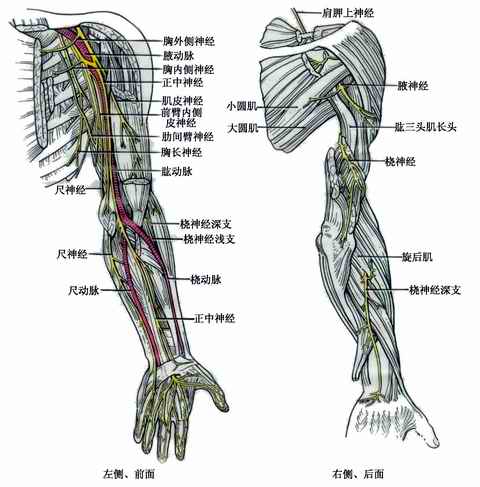 bC6影像园XCTMR.com (2)正中神经 自臂丛发出,沿肱二头肌内侧下降至肘窝,向下行于前臂前群浅、深层肌之间,经腕入手掌。正中神经肌支支配除尺侧腕屈肌、肱桡肌和指深屈肌尺侧半以外的所有前臂屈肌和旋前肌,手掌外侧肌群(拇指内收肌除外)及中间群的小部分;皮支分布于掌心、鱼际、桡侧三个半指的掌面及其中节和远节指背面的皮肤。