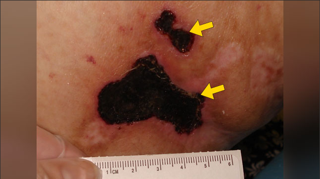 3、一名62岁女性,患有2型糖尿病、高血压、慢性肾功能不全(慢性肾病IV期)。因数月来沿大腿内侧和背侧胫骨分布区出现溃疡性损伤入院。损伤处变硬,坏死的斑块边缘钙化并伴有白色颗粒状斑点。腿部没有出现水肿,没有明显的局部淋巴结肿大表现。