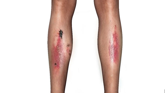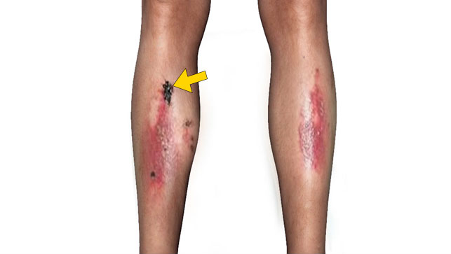 4、一名38岁的女性患者,患有1型糖尿病14年。体格检查,小腿双侧损伤。