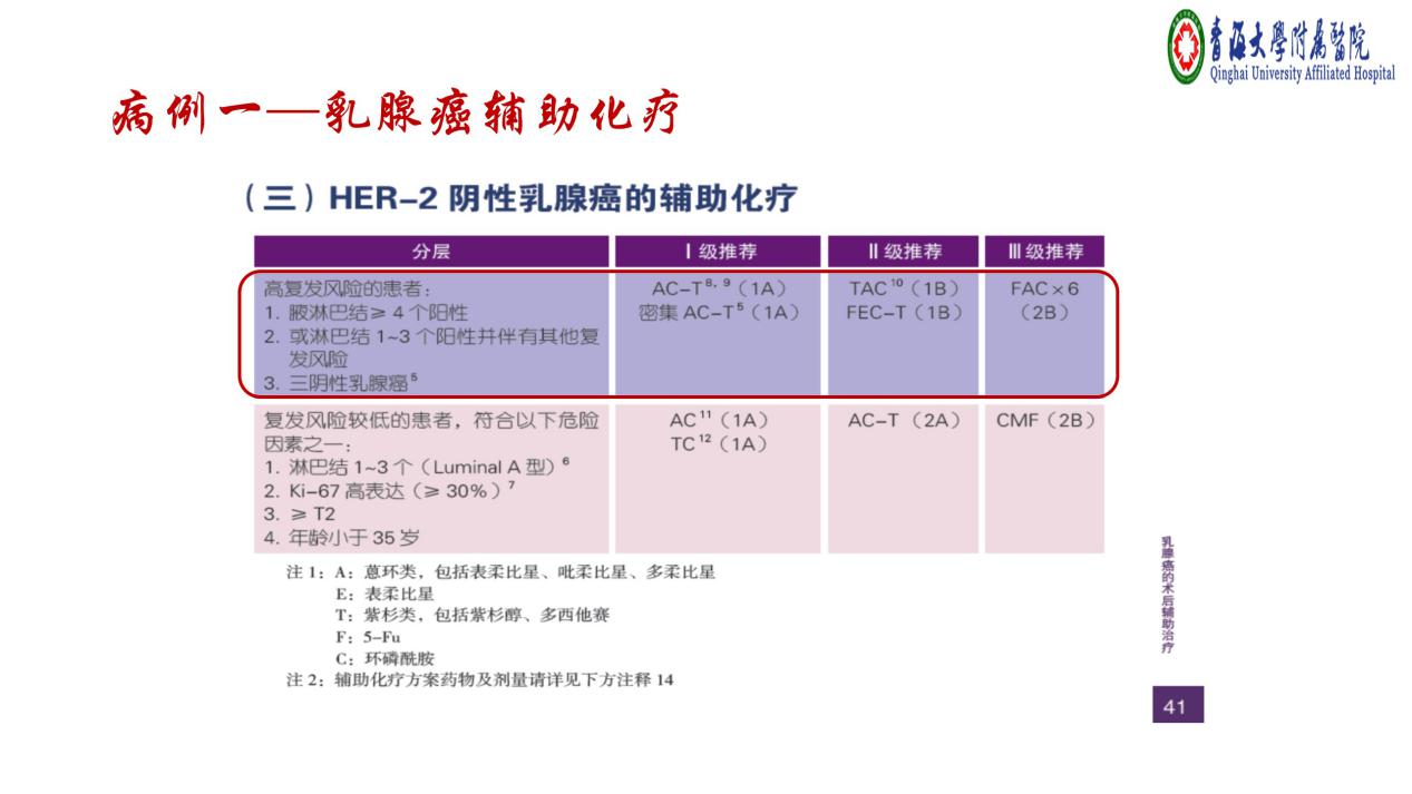 是通过哪些病例改变了我对Watson的看法呢?首先我们看第一个病例,一位41岁绝经前女性,2018年5月30日在天津市肿瘤医院行“左乳癌改良根治术”,术后病理诊断是浸润性癌,大小约3*3*3cm大小,脉管内可见癌栓,腋窝淋巴结17枚,其中三枚可见癌转移,免疫组化:ER(-),PR(-),HER-2(1+),P53(强阳性),Ki-67(阳性细胞>50%),CD34(血管+),E-CD(+)。这位患者的诊断是:左乳癌术后,分期为T2N1M0 IIB期。这对我们绝大多数医生来说是一例非常简单的病例,如果我们查询指南那么一般会选择AC-T或者TAC方案作为可考虑的化疗方案,但是当我在门诊接诊这位患者看到她使用的化疗方案后我非常的诧异,她在外科做的治疗,化疗方案为4周期的TC方案。