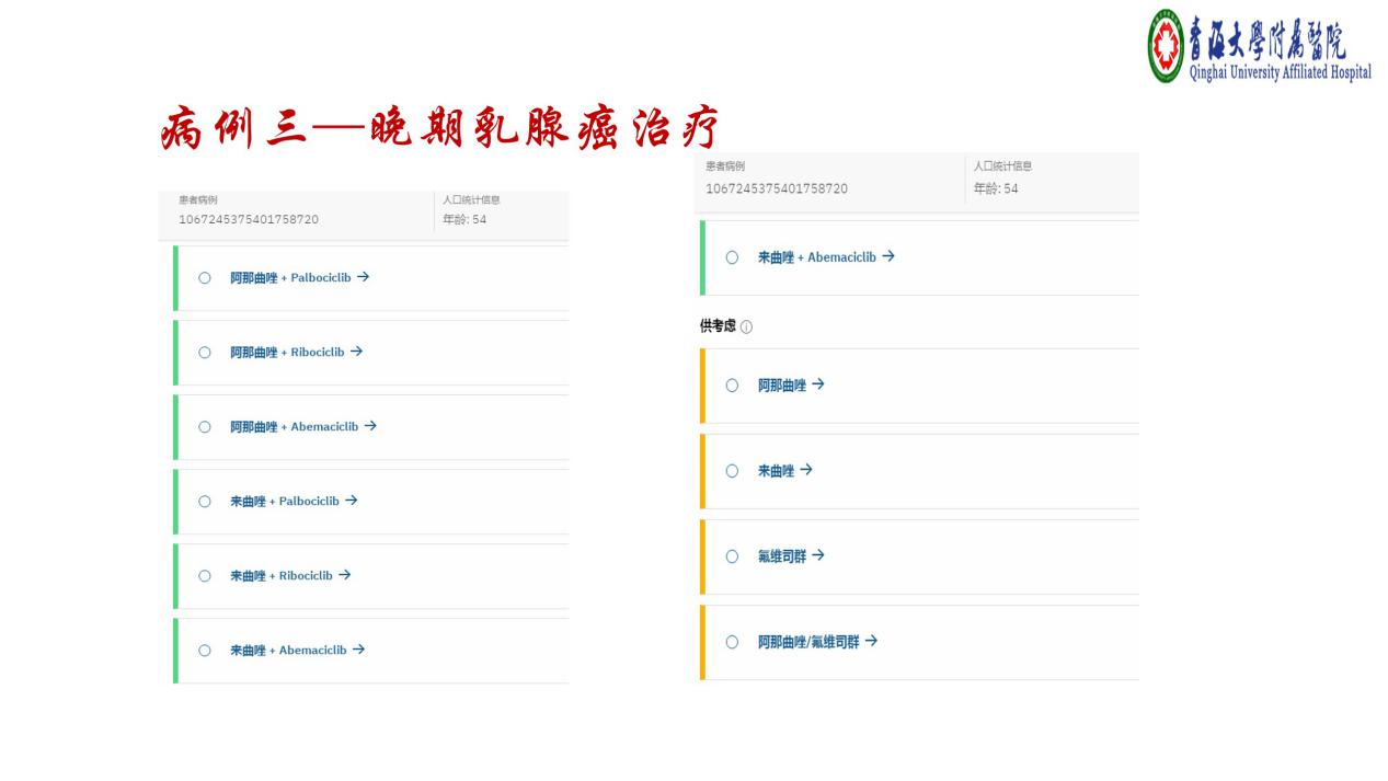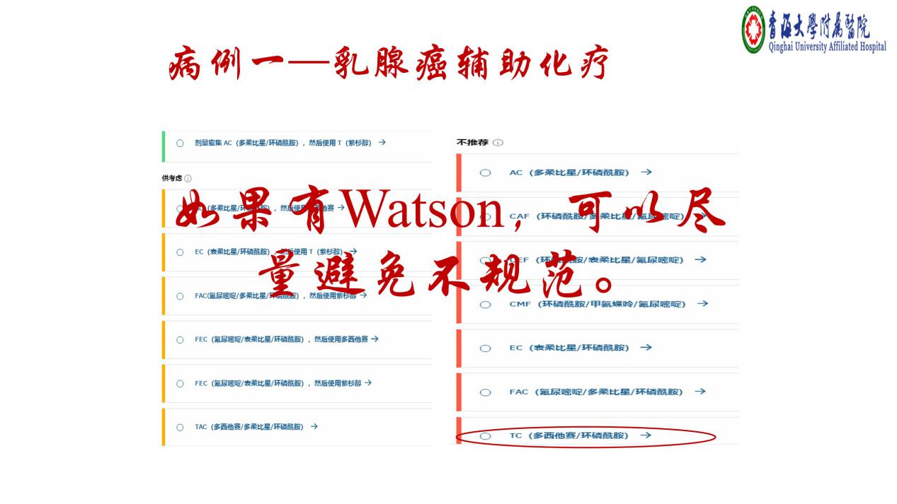 我又使用Watson跑了一下这个病例,Watson给出的首选治疗方案也是内分泌治疗,可以联合Palbociclib。这位患者也是我在门诊接诊的患者,那么她的实际治疗使用的化疗治疗,EC两个周期病情稳定后换成DX6个周期,后来口服希罗达维持治疗。如果按照Waston、按照指南提供的治疗建议,显然这位患者的既往治疗是不规范的,我想其实对于我们肿瘤科医生来说,要学习的知识非常非常多,不同的肿瘤每年都有那么多的临床试验、那么多的新进展,如果让我们医生把这些都掌握实际上非常困难,并且每个医生往往都会有不同专业的偏向性,比如说我,可能更加擅长胸部肿瘤,那么对于其他的肿瘤,使用Watson可以让我们学到更多的知识,尽量避免一些不规范,所以Watson作为质控工具也是很好的选择。