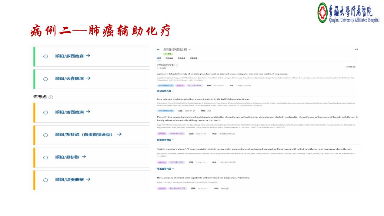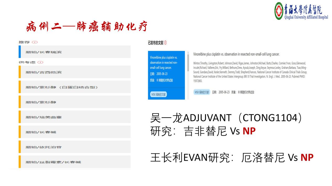 但是Watson给出的建议首选的治疗方案是顺铂联合长春瑞滨,这和我们常规首选的方案好像有点差异,并且大家需要注意到吴一龙教授的ADJUVANT研究以及王长利教授的EVAN研究选择的对照组都是NP,而不是我们常规想到的紫杉或者吉西他滨联合铂类。看到这些之后我复习了文献,发现其实NP方案是循证医学证据最充分的一个方案,包括IALT、JBR.10、CALGB9633、ANITA研究里面均提示NP是标准的方案。IALT研究中NP方案的PFS和OS提高了5%左右,这篇文献发表在新英格兰上。JBR.10研究中选择的是IB期和II期的患者,治疗的选择也是NP方案,研究显示使用该方案OS提高5%左右,这篇文献也发表在新英格兰上。ANITA研究中NP方案它的PFS和OS都有明显的延长,这篇文献发表在Lancet Oncol上。在JCO上发表的类似试验实际上是一个Meta分析,数据的结果还是显示五年生存率有5%的提高。也就是说不论是临床试验还是Meta分析,NP方案都显示生存率有5%的提高,并且这四篇文献都是发表在高分杂志上,所以说Watson给出的循证医学证据是最高的。