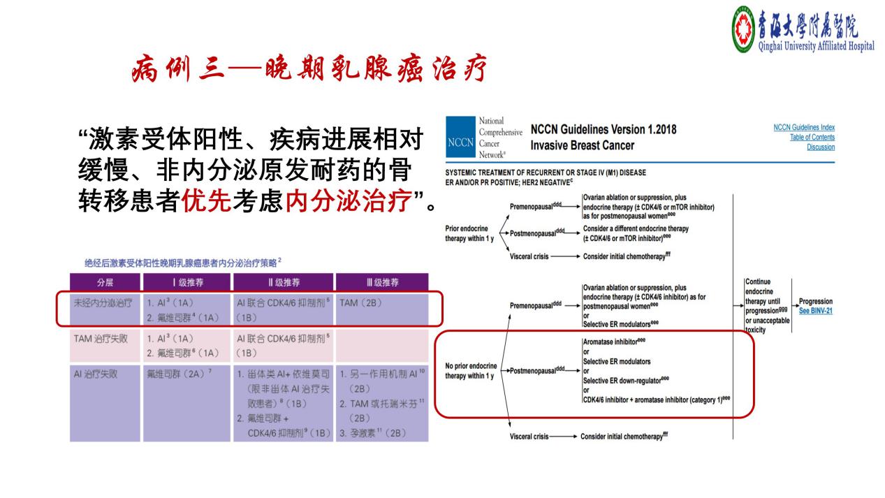指南告诉我们激素受体阳性、疾病进展相对缓慢,非内分泌原发耐药的的骨转移患者可优先考虑内分泌治疗,所以从指南角度可以首先考虑内分泌治疗,无论是芳香化酶抑制剂或者氟维司群都是可以的。
