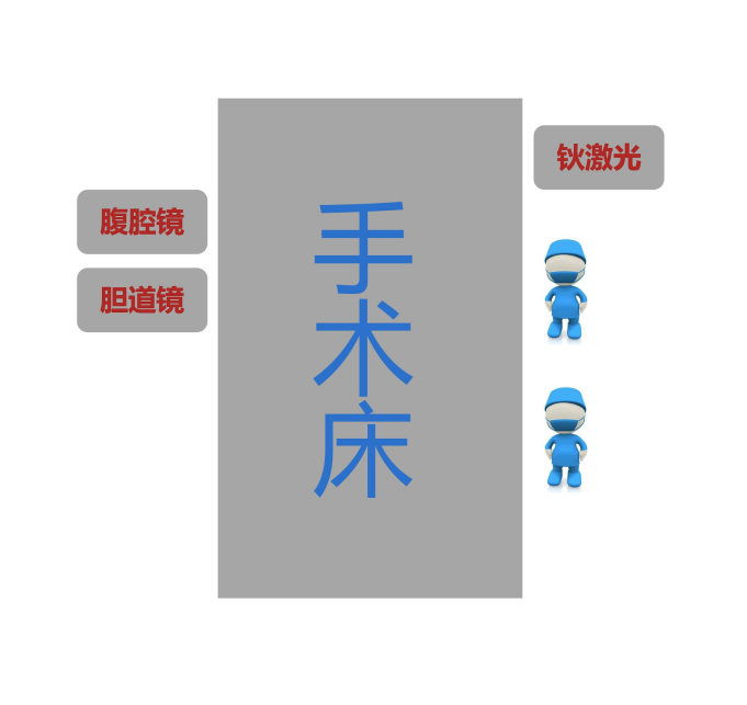 胆道镜已广泛应用于胆总管结石、肝内胆管结石的病症患者,尤其在腹腔镜视野下用胆道镜配合取石篮是我们外科医生解决胆道结石的重要手段,彰显微创治疗的优势。不过有时碰到结石较大的时候也只能望尘莫及,所以就衍生出了各种碎石手段,其中钬激光是其中方法之一。那在操作的时候有哪些需要注意的呢?可能有些医生见过老一辈肉眼直视下胆道镜探查,一通操作后过去了 5 分钟效果甚微,脖子和眼睛受不了,旁人看不到里面情况也给不了建议。所以一定要连接视频显示器,在镜下操作更直观,而且大家都能给建议和提醒,提高取石的效率。更重要的是目镜部分保持了绝对的无菌,这对于手术是至关重要的。腹腔镜、胆道镜+显示器、钬激光,这些设备体型庞大、管路众多,摆放位置也会影响手术医生的操作连贯性。笔者综合周边医护人员使用管理经验后认为以下设备布局相对妥当。LC 手术腹腔镜基本位置固定,胆道镜与显示器放在腹腔镜机组旁,形成双显示器均在窄视野内的布局,并且保持胆道镜主机散热良好。钬激光占据面积较大,可放在操作者的操作手侧,保持光纤适当的使用长度即可,这样摆放的另一个好处在于光纤和胆道镜、吸引器不会形成交集,避免光纤损伤且更利于操作。