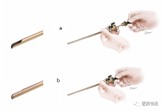 一套完整的硬性膀胱镜由镜鞘、闭孔器、观察镜(光学视管)和镜桥组成,依据使用范围具有不同的规格和型号。镜鞘是硬性膀胱镜的金属外鞘,长28~32cm,外径8~25Fr(2.6~8.0mm),分别适用于从儿童直至成人,成人的常用范围为19~22Fr。镜鞘带有进水和出水开关,闭孔器插入鞘内可使镜鞘头端呈闭合状。二者组合后镜鞘头端略微上翘圆润便于进入并通过尿道,降低尿道损伤的机会。a.闭孔器部分插入,头端未闭合;b.闭孔器完全插入锁定,头端闭合状(图片:《泌尿外科内镜与微创技术图解. 膀胱镜篇》中国医药科技出版社)▼