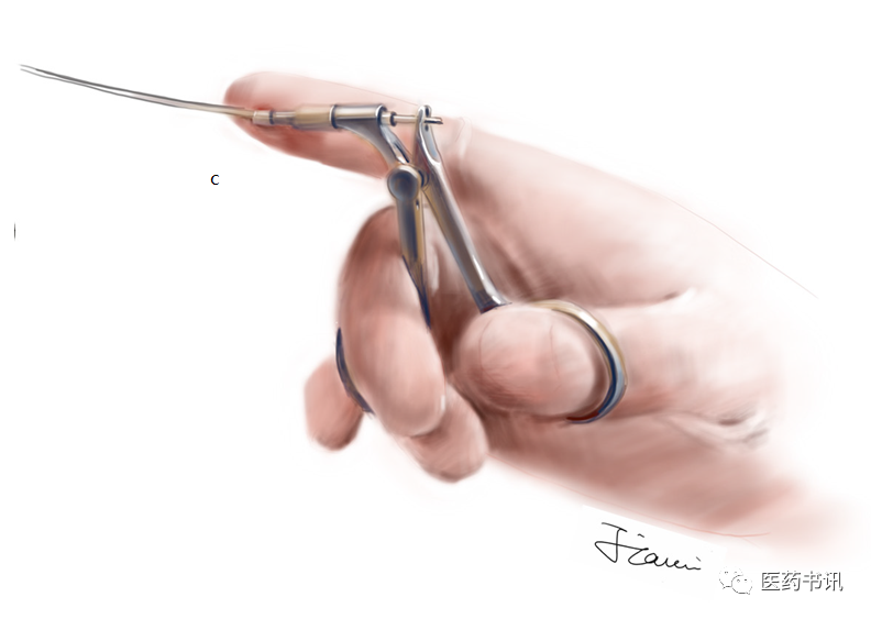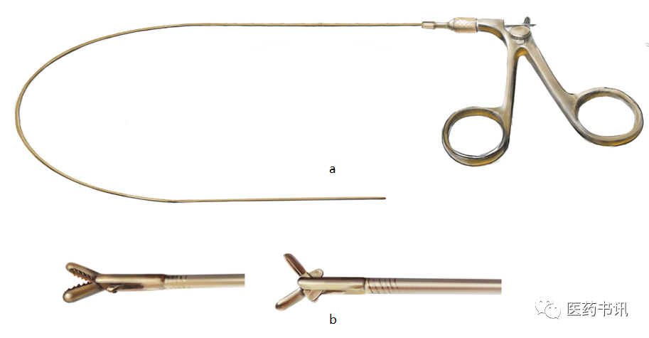 注意:过细型号的探子扩张尿道时容易损伤尿道黏膜产生假道,因此起始选择不宜过细。用于抓取组织或实物,是膀胱镜常用器械。钳子的插入部分柔韧,通过工作通道插入后用于镜下组织活检、取异物、调整或拔除输尿管支架等操作。活检钳头端勺状无齿,抓取后可以紧密闭合,组织不易滑落。异物钳则为带齿设计,提高抓取力量。a.外观;b.头端:异物钳(左)、活检钳(右);c.握持手型(图片:《泌尿外科内镜与微创技术图解. 膀胱镜篇》中国医药科技出版社)▼