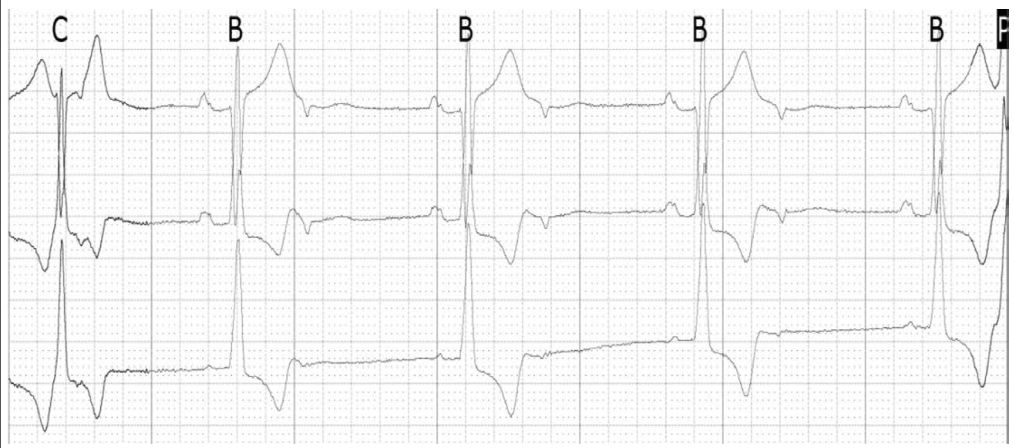 故事到此告一段落了,虽然这是个比较罕见的病例,但其中有一些值得我们掌握的知识点。一般情况下,双抗治疗 3~6 个月后,终身单抗治疗(阿司匹林 100 mg qd + 氯吡格雷 75 mg qd 3~6 个月,之后阿司匹林 100 mg qd)。有瓣膜血栓者,予单纯抗凝治疗。结合本病例,我们着重谈一下 TAVI 术后心脏传导阻滞这类并发症,因主动脉瓣环位置紧邻室间隔,在手术操作过程中容易出现房室传导阻滞和左束支传导阻滞。我曾经就遇到一例术后新发完全性左束支传导阻滞患者,该心律失常是术后即刻出现的,因没有血流动力学异常,因此未再进一步干预,随后多次复查心电图均为完全性左束支传导阻滞。本例患者 TAVI 术后心电图出现了不完全性左束支传导阻滞,但病例没提供是即刻出现的还是和随后的交接区早搏同时出现的。图 2 中第 3 个 QRS 波出现比较早,其前无明显 P 波,其主波方向与前窦性心律下传心室后的 QRS 波一致,但较宽,随后出现一个倒置 P 波,与第 4 个心动周期的 P 波方向不一致,没有认为是 II 度房室传导阻滞,推测为交界性早搏伴逆传 P 波,但第 4 个心动周期出现较晚,考虑与之前逆传 P 波激动心房,导致窦性 P 波落入其不应期,造成不能下传所致,这属于 3 相阻滞。细心的您可能已经发现了,第 4、5 个心动周期中的 QRS 波较此后的 QRS 波略宽(似乎 P 波也较此后的略宽),另外,第 4 个心动周期后的倒置 P 波出现并不早,但也没有下传心室。这是由于正常情况下,心房、希浦系统和心室不应期长短是与心率直接相关,即心动过速时有效不应期缩短,心动过缓时有效不应期延长,当第 3 个心动周期过早出现,导致第 4 个心动周期延迟出现,随即有效不应期延长,第 4 个心动周期后的交接区早搏落入下传区域的有效不应期,因此未能下传心室,而第 5 个心动周期进一步延迟出现,这属于 4 相阻滞。对于第 4 个心动周期以及 Holter 中 T 波之后的倒置 P 波,您是否考虑过室房逆传?因正常人可能并不存在室房逆传,因此不存在释放逆传时间的正常值,但小样本研究发现,随着心室刺激频率延长,室房逆传时间延长,平均约 200 ms 左右,但区间较宽。结合临床经验,室房逆传 P 波一般紧邻 QRS 波,很少出现在 T 波之后。因此,推测第 4 个心动周期以及 Holter 中 T 波之后的倒置 P 波为早搏。本病例中,虽然经过推断患者出现长 RR 间期是由于交接区早搏所致,但缺乏客观证据,电生理检查验证了之前的推断。因此,医生果断放弃安装永久起搏器,而使用 β 受体阻滞剂抑制早搏,认为这种心律失常是由于术后局部炎症水肿造成,这有点类似于房颤消融术后的空白期。经过几周的治疗和恢复,患者症状消失,心电图的早搏和左束支阻滞也消失了,更说明了可能是炎症反应所致。该病例也为我们提供了经验,TAVI 术后的短暂心律失常可能由于炎症水肿反应所致,要认真分析心电图,并观察病情变化,不能贸然植入永久起搏器。