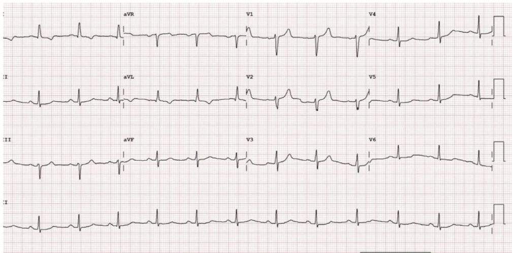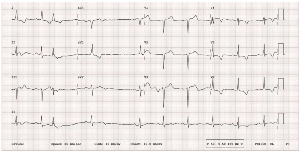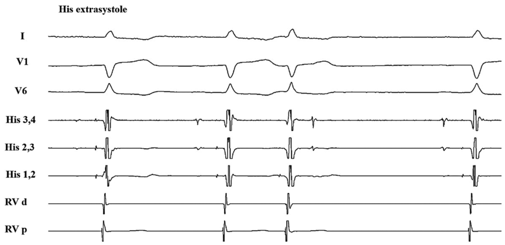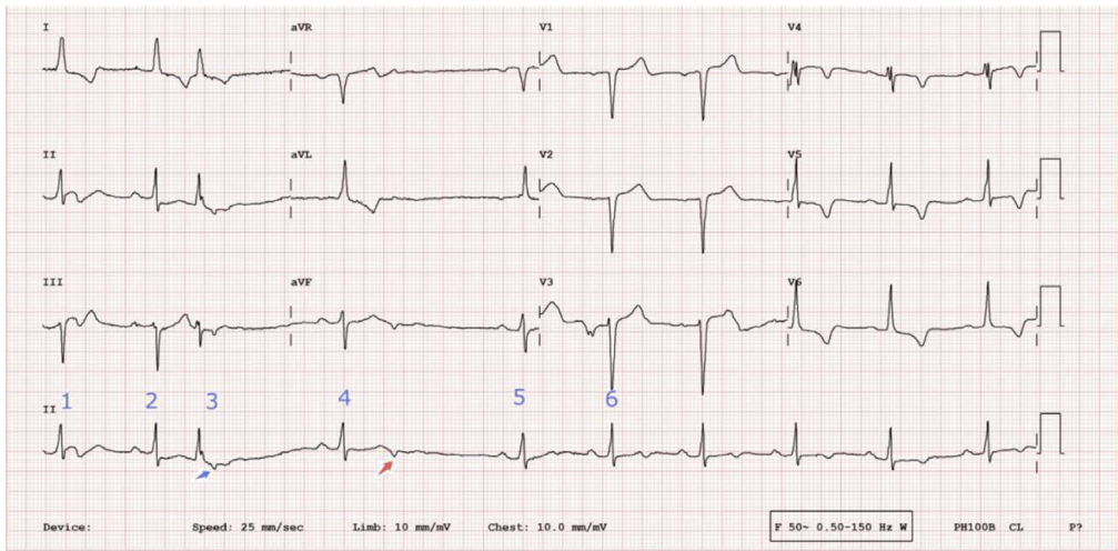 65 岁的李大爷最近总感觉活动耐量下降,家住在五楼的他最近就连爬楼都得歇几次。这天,李大爷像往常一样送小孙子上学,眼看公交车就要到站了,李大爷拉着小孙子紧跑了两步,随后就上气不接下气,眼前甚至有点发黑,差点摔倒。路人看到李大爷的情况,赶紧拨打了 120,并联系了他的儿子。十几分钟后,救护车赶到了,把李大爷和小孙子送到了附近的医院。救护车刚到,李大爷的儿子也赶到了,急救人员把大爷用担架车推到诊室,当班医生立即来到李大爷身边,一边询问既往病史,一边做测量生命体征。李大爷患有糖尿病和高血压 20 余年了,否认其他系统疾病史。此时李大爷体温 36.5 ℃,脉搏 85 次/分,呼吸 22 次/分,血压 170/90 mmHg,双肺呼吸音粗,双肺底可闻及少许细湿啰音,心律齐,主动脉瓣听诊区可闻及 Ⅲ/6 级收缩期杂音,双下肢无水肿。心电图为窦性心律,非特异性 ST-T 改变。心脏彩超:左房增大,左室壁略厚,主动脉瓣重度狭窄伴钙化,瓣口面积 0.9 cm²。李大爷随后被转入心血管内科进一步治疗,经过药物治疗后,他的症状基本消失了,考虑到李大爷拒绝行主动脉瓣置换术,最终接受了经导管主动脉瓣置入术(TAVI)治疗。术后复查心脏彩超人工主动脉瓣功能正常,无瓣周漏。很快李大爷出院了。回到家中的李大爷活动耐量明显提高,又能像以前一样正常生活了。但好景不长,2 周后李大爷经常出现头晕,严重时近乎晕厥,而出现这些症状前并没有什么诱因,这令全家人非常苦恼。为此,李大爷再次到医院就诊并办理了住院手续,入院后的心电图令医生额头渗出了汗珠(图 1),竟然出现迟发房室传导阻滞(2:1 房室传导)!难道需要给患者植入永久起搏器吗?为此全科对此病例进行了讨论,并仔细分析了心电图(图 2)。入院心电图考虑窦性心律,不完全性左束支传导阻滞,根据长 II 导联可见交界性早搏伴室内差异性传导,图 2 中第 3 个 QRS 波后可见倒置 P 波,随后出现长间歇,第 4 个 T 波后可见倒置 P 波,随后,又出现长间歇,两个倒置 P 波形态类似,从第 5 个心动周期开始未再出现长间歇。推测为房室交接区早搏未下传心室导致的心动过缓。之后的 Holter 检查得出了同样的推测(图 3),第 1 个 QRS 波后可见倒置 P 波,而第 2、3、4 个 T 波后可见倒置 P 波。为了验证是否存在房室传导阻滞,李大爷接受了电生理检查(图 4),并未发现房室传导阻滞,这间接证明了之前的推测。最后,李大爷躲过了永久起搏器的植入,而仅仅使用了 β 受体阻滞剂治疗,几周后李大爷头晕症状消失,心电图中的不完全性左束支传导阻滞和交接区早搏也未再出现(图 5),李大爷一家的心情终于满天乌云散去。