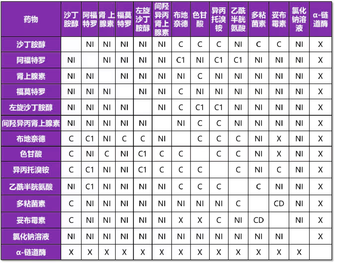 《Trissel 混合组分的稳定性》和 Trissel 的两个临床药剂学数据库 [2-3]对国内外雾化吸入药物的配伍使用情况进行了全面的总结(需注意的是:除布地奈德、沙丁胺醇、异丙托溴铵、乙酰半胱氨酸外,其他药物国内并无专用雾化吸入制剂):