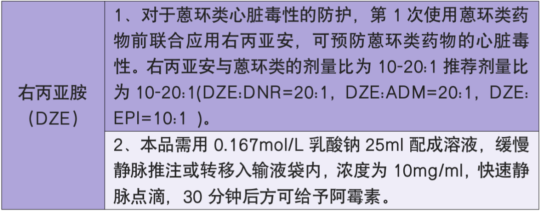 目前不推荐白蛋白结合型紫杉醇给药前进行预处理。但需注意,发生过紫杉醇注射液超敏反应的患者,使用白蛋白结合型紫杉醇替代治疗时,仍需密切观察其过敏反应的发生。作用机制:多西他赛是在紫杉醇的基础上进行结构改造而得到的,与紫杉醇均属紫衫烷类药物。多西他赛 (多烯紫杉醇) 作用与紫杉醇 (PTX) 相同,为 M 期周期特异性药物,促进小管聚合成稳定的微管并抑制其聚解,从而使小管的数量显著减少,并可破坏微管网状结构。不良反应机制:紫杉烷类药物的水溶性较低,因此需要在其注射剂中添加某些有机溶剂增加溶解性。多西他赛的助溶剂是聚山梨酯,可发生过敏反应,多在用药开始 10 min 出现,症状轻微可不需停止治疗,一旦血压下降、支气管痉挛或全身皮疹/红斑,需立即停止静脉滴注。此外,多西他赛会引起毛细血管壁通透性增高,促使蛋白质从血浆渗出至组织间隙,有效滤过压增加,液体滤过增强并滞留于组织间隙,导致水肿形成。使用前需要使用激素预防过敏反应和体液潴留。多西他赛治疗前一天开始口服地塞米松 8 mg、q12 h,持续至少 3 天。作用机制:蒽环类药物是抗肿瘤药物常用的药物之一,包括柔红霉素(DNR)、阿霉素(ADM)、表阿霉素(EPI)、吡喃阿霉素(THP)、去甲氧柔红霉素(IDA)。通过抑制 DNA 复制与 RNA 合成,抑制拓扑异构酶 II,螯合铁离子后产生自由基从而破坏 DNA、蛋白质及细胞膜结构等抗肿瘤。主要适用于白血病、淋巴瘤、乳腺癌、卵巢癌和肺癌等。不良反应机制:蒽环类药物的主要毒性表现为心脏毒性,可表现为心内传导紊乱和心律失常,甚至充血性心力衰竭。通常来说,蒽环类药物的心脏毒性呈现剂量累积性。右丙亚胺(DZE)可以有效预防蒽环类药物所致心脏毒性。