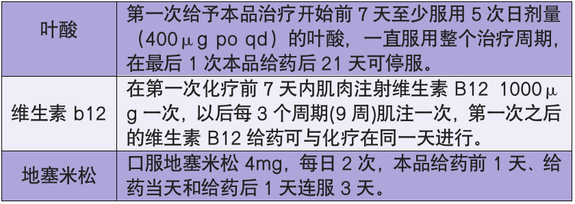 不良反应机制:培美曲塞是一种多靶点叶酸拮抗剂,通过抑制胸苷酸合成酶(TS)、二氢叶酸还原酶(DHFR)和甘酸甲基转移酶(GARET)的活性发挥作用, 这些酶都是胸腺嘧啶核苷酸和嘌呤核苷酸生物再合成的关键性叶酸依赖性酶。从而破坏细胞复制所需的叶酸依赖性正常代谢过程,抑制细胞复制。在抑制肿瘤细胞复制的同时培美曲塞同样抑制正常细胞的复制,主要表现在骨髓毒性贫血及胃肠道反应。为预防或减少治疗相关的血液学不良反应(贫血),培美曲塞治疗过程中必须补充叶酸和维生素 B12。