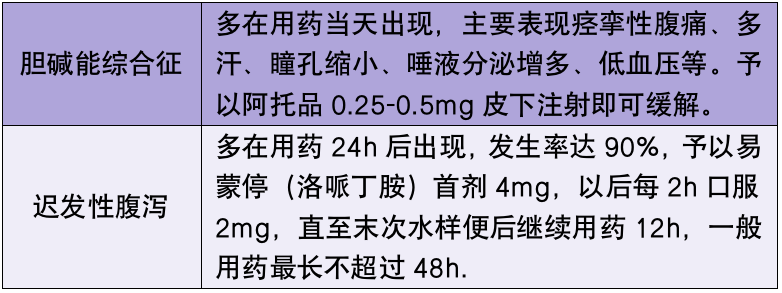 作用机制:CPT-11 为 DNA 拓扑异构酶 I(Topo I) 抑制剂,其与 Topo I 及 DNA 形成的复合物能引起 DNA 单链断裂,阻止 DNA 复制及抑制 RNA 合成,为细胞周期 S 期特异性。主要用于大肠癌、胃癌、非小细胞肺癌。不良反应机制:伊立替康主要通过非竞争性抑制体内乙酰胆碱酯酶活性,引起乙酰胆碱异常堆积,导致胆碱能神经异常兴奋, 而引发胆碱能综合征导致的早发性腹泻、腹痛、出汗、鼻炎、低血压、血管舒张、瞳孔缩小、流泪等不良反应。严重者腹痛剧烈、腹泻频繁、大量出汗致衣物浸透、低血压致头晕, 若合并恶心、呕吐等不良反应, 易引发脱水、晕厥, 严重影响患者生活质量, 降低患者顺应性和用药安全性。CPT-11 主要可能出现的不良反应为胆碱综合征及迟发性腹泻。阿托品可以有效治疗并预防胆碱能综合,减少胆碱能综合征的发生,予以洛哌丁胺止泻。临床常用剂量为阿托品 0.5 mg 皮下注射。易蒙停(洛哌丁胺)首剂 4 mg。