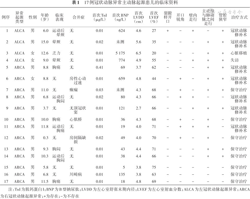 17例患儿中行冠状动脉修补术7例,其中ALCA 2例、ARCA 5例。1例ALCA患儿(例2)因运动后晕厥、心源性休克在外院行体外膜氧合及主动脉球囊反搏治疗,病情好转后入本院行冠状动脉修补术。2例ALCA患儿(例1、2)术前均存在LVEF降低,术后无心源性晕厥,但随访期间LVEF无明显改善。1例ALCA患儿(例3)因心力衰竭行心脏移植。1例ALCA患儿(例4)建议手术治疗后家长拒绝后失访。余8例患儿无特异性治疗,随访观察(表1)。门诊规律随访6 (6,12)个月,均无心血管不良事件发生,无心功能显著降低者。