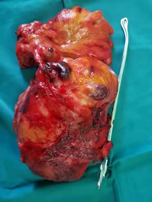今天这个病例肿瘤体积很大,上至骨盆口,下至阴道口,侵犯阴道及直肠,与膀胱后壁关系密切,输尿管扩张,肿瘤占据盆腔空间,很固定。为患者行后盆腔廓清术,保住肛门及膀胱。