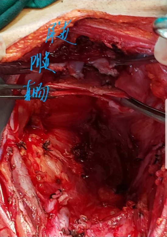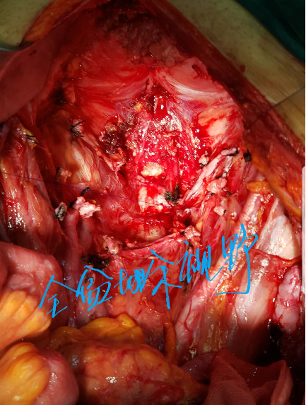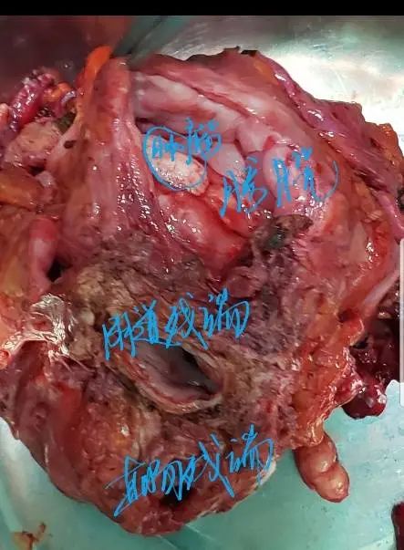 这是一位宫颈癌,直肠阴道瘘并出血,侵犯膀胱的患者,行全盆腔脏器切除。