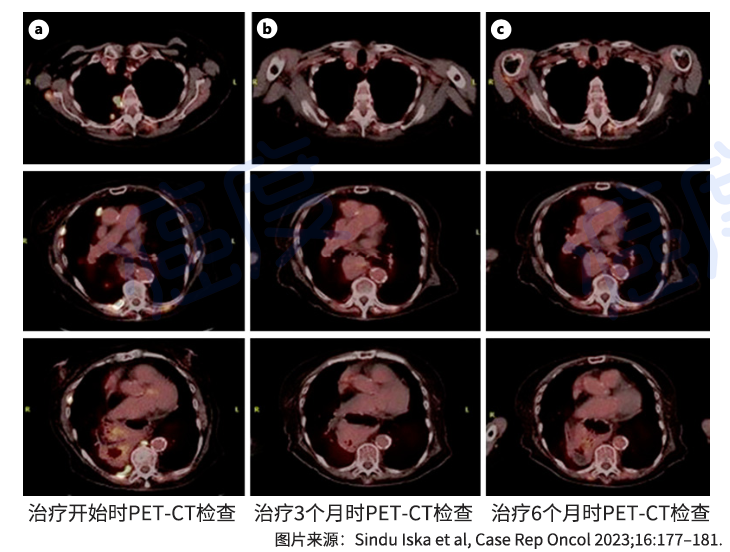 治疗三个月后,PET-CT影像学检查显示病灶已经消失,达到完全缓解。也就是说,所有影像学检查都看不到肿瘤病灶了。治疗六个月后,PET-CT检查仍然显示病情稳定。目前,她仍在接受AMG510的靶向治疗,耐受性良好,生活质量与患病前相比没有什么变化。