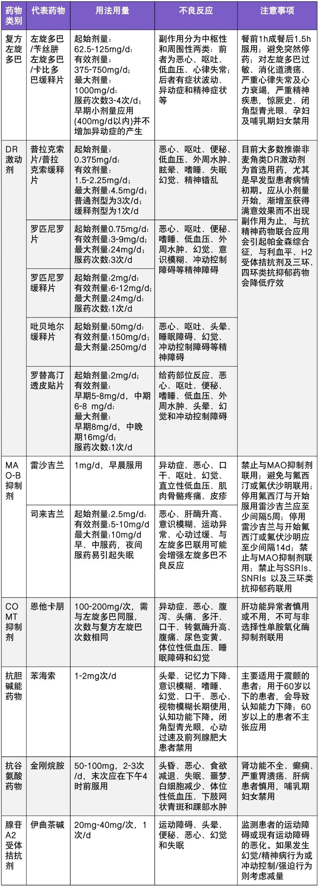 2)小剂量开始滴定,兼顾提高疗效和减轻药品不良反应。3)个体化给药(综合考虑患者症状、年龄、共患病、意愿、经济承受能力、药物不良反应情况等)。帕金森病的治疗药物,包括复方左旋多巴、多巴胺受体激动剂(DAs)、单胺氧化酶 B 型抑制剂(MAO‑BI)、儿茶酚‑O‑甲基转移酶抑制剂(COMTI)等,关于药物的用法用量、不良反应及注意事项详见表 1。左旋多巴是治疗帕金森病的标准疗法,是帕金森病药物治疗中最有效的对症治疗药物。包括麦角类 DAs 和非麦角类 DAs,其中麦角类由于可能引起瓣膜病变的严重不良反应,临床已少用,而主要推崇采用非麦角类,并作为早发型患者病程初期的首选药物,包括普拉克索、罗匹尼罗、吡贝地尔、罗替高汀和阿扑吗啡。包括第一代 MAO‑BI 司来吉兰常释片和口崩片(国内未上市)及第二代 MAO‑BI 雷沙吉兰,以及国内尚未上市的双通道阻滞剂沙芬酰胺、唑尼沙胺。对于帕金森病患者的运动症状有改善作用,同时在目前所有抗帕金森病药物中可能相对有疾病修饰作用的证据,主要推荐用于治疗早期帕金森病患者,特别是早发型或者初治的帕金森病患者,也可用于进展期的帕金森病患者的添加治疗。主要有恩他卡朋、托卡朋和奥匹卡朋以及与复方左旋多巴组合的恩他卡朋双多巴片(为恩他卡朋/左旋多巴/卡比多巴复合制剂,按左旋多巴剂量不同分成 4 种剂型)。在疾病早期首选恩他卡朋双多巴片治疗可以改善症状,但能否预防或延迟运动并发症的发生,目前尚存争议,在疾病中晚期添加 COMTI 治疗可以进一步改善症状。国内有苯海索,主要适用于有震颤的患者,而对无震颤的患者不推荐应用。对 60 岁以下的患者,需告知长期应用可能会导致认知功能下降,所以要定期筛查认知功能,一旦发现认知功能下降则应停用;对 60 岁以上的患者尽可能不用或少用。包括常释片和缓释片,国内目前仅有前者,对少动、强直、震颤均有改善作用,对改善异动症有效。注:DAs:多巴胺受体激动剂;MAOBI:单胺氧化酶 B 型抑制剂;COMTI:儿茶酚O甲基转移酶抑制剂;MAO:单胺氧化酶;SSRIs:选择性 5-羟色胺再摄取抑制剂;SNRIs:5-羟色胺去甲肾上腺素再摄取抑制剂