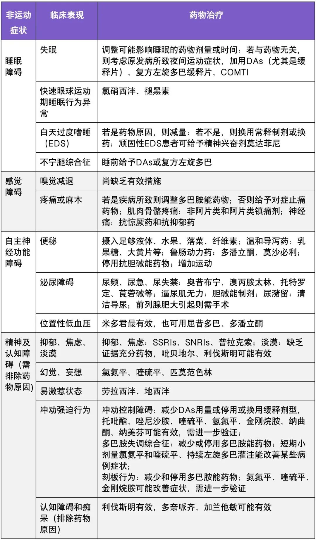 帕金森病的非运动症状严重影响患者的生活质量,近年来逐渐得到重视。帕金森病的非运动症状涉及许多类型,主要包括睡眠障碍、感觉障碍、自主神经功能障碍和精神及认知障碍。帕金森病的非运动症状的治疗详见表 2。