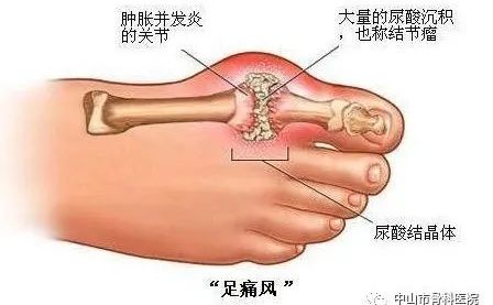 痛风的临床表现:常最先在“大脚趾头内侧”发作,也可在踝、膝、肘、手等部位发作,急性期表现为关节红肿剧烈疼痛,若长期未系统诊治,可能会出现关节活动受限、畸形及残疾。痛风的治疗:
