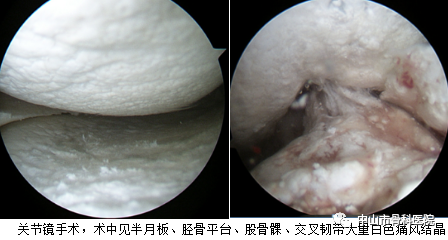 1.手术切口小,手术时间短,并发症小,感染发生率低,恢复快,住院时间短,费用较低。2.通过刨削器的切削和冲洗液的灌洗,可以清楚大量的白色痛风结晶和炎症因子,减轻患者疼痛。3.典型的痛风性关节炎尿酸盐结晶在关节镜下呈“暴风雪”样改变,关节镜下能直视病变部位,明确诊断。4.痛风石引起膝关节囊挛缩,髁间窝狭窄卡压,膝关节伸直受限,微创手术能松解关节囊,解除卡压。