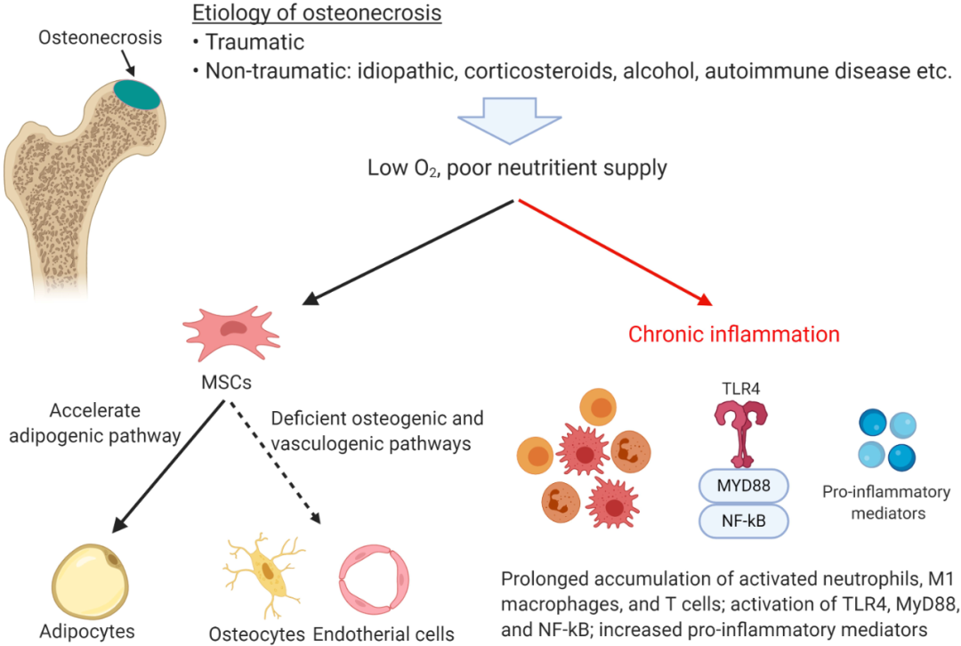 尽管许多病因与骨坏死有关,但最终涉及到受影响区域的氧气和营养供应不足(图1)。这些事件与骨髓间充质干细胞沿着成脂途径分化增强以及成骨、成血管不足。然而,在某种程度上,受影响的解剖区域显示出慢性炎症、细胞死亡修复受损的组织学证据。实时图像探针分析显示,小鼠血管烧灼诱导骨坏死6周后,活化的巨噬细胞和中性粒细胞局部持续存在。在其他研究中,激素相关的大鼠骨坏死导致PRR toll样受体4 (TLR4)的上调,大多数TLRs的下游适配蛋白髓系分化因子88 (MyD88)和炎症蛋白的主要转录因子核因子-κB (NF-κB)和单核细胞趋化蛋白-1 (MCP-1)上调。