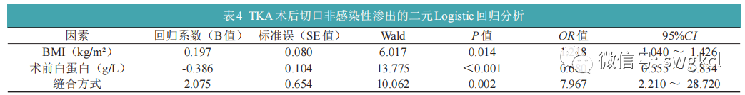 BMI增高(OR=1.218,P=0.014)、间断缝合(OR=7.967,P=0.002)为TKA的危险因素,术前白蛋白增高(OR=0.680,P<0.001)为保护因素。BMI每增加1 kg/m2,切口非感染性渗出风险增高1.218倍;术前白蛋白每增高1 g/L,切口非感染性渗出风险降低32%;间断缝合发生切口非感染性渗出是连续缝合的7.967倍。