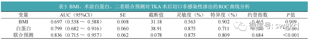 ROC曲线下面积(area under curve,AUC)结果显示,术前白蛋白和BMI最佳截断值分别为38.91 g/L和31.18 kg/m2,预测TKA术后切口非感染性渗出的AUC分别为0.799和0.697,术前白蛋白对其有一定的预测价值,但BMI的预测价值较低。将二者进行联合诊断,AUC为0.836,有较高的诊断价值,见表5。