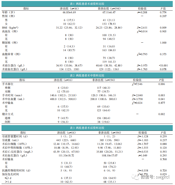 收集自2018年1月至2022年4月河南大学第一附属医院骨科收治并行全膝关节表面置换术患者的临床资料,根据纳入与排除标准,共纳入210例,根据患者是否出现术后切口非感染性渗出,分为两组:渗出组16例,非渗出组194例。渗出组中男6例,女10例;年龄54 ~ 74岁,平均(66.85±4.69)岁。非渗出组中男41例,女153例;年龄53 ~ 84岁,平均(67.11±6.47)岁。