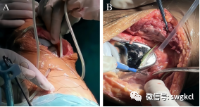 图1 全膝关节表面置换术中放置引流管:A. 放置中;B. 放置后