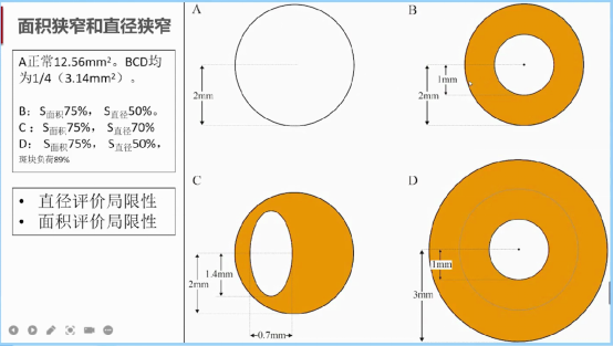 图10:闭塞示意图此外,还需注意的是面积狭窄和直径狭窄。CCTA里所说的“狭窄”是指直径狭窄。直径狭窄比例与面积狭窄的比例不等同(图11)。向心性狭窄时,直径狭窄50%等于面积狭窄75%(图11-B)。但当狭窄为椭圆形时,面积狭窄为75%,但直径狭窄变成了70%(图11-C)。当血管正性重构向外扩张时,相同面积,斑块负荷加大到89%(图11-D)。由此可见,当出现血管不规则狭窄等情况,直径狭窄存在误差。这在阅片诊断时需要适当关注。