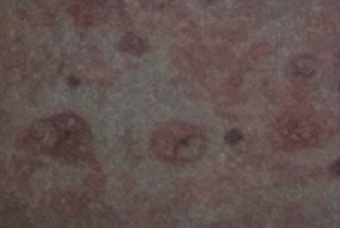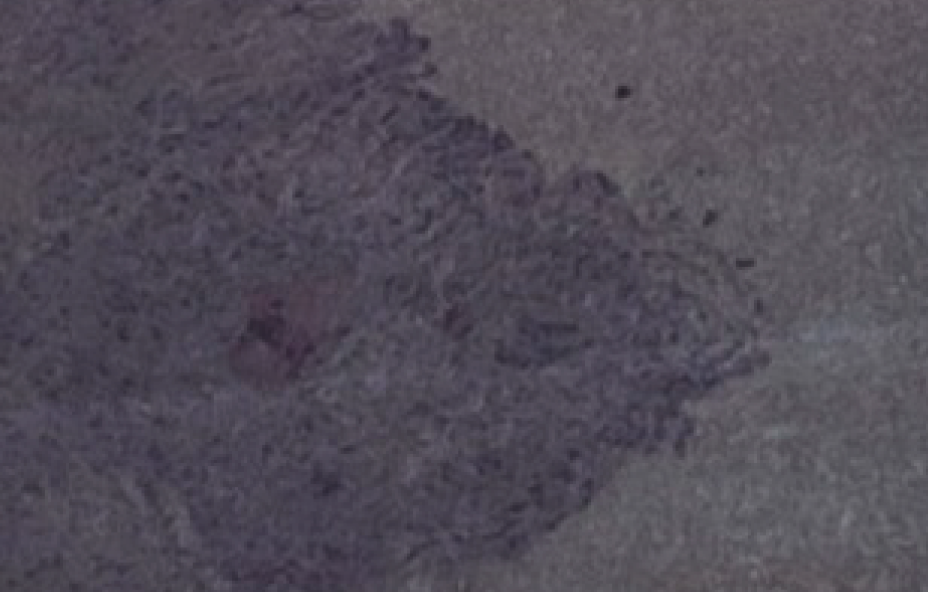 网膜腹膜活检术,术后病理报告示:可见多个结核结节。上皮样细胞及淋巴细胞增生,可见朗汉斯巨细胞。诊断:(网膜)结核。(见下图)