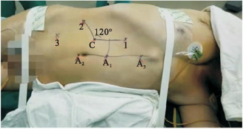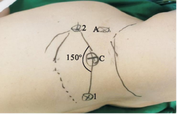 在患者开始手术前,经气管插管全身麻醉。患者处于90°健侧卧位,适度伸展腰桥,利于更好的暴露术野。于腹直肌外缘平脐点处使用气腹针穿刺,建立15 mmHg(1 mmHg=0.133 kPa)气腹。将镜头置入患侧距脐部斜上方3~4 cm处腹直肌外侧缘,长度为10 mm的切口中,并通过镜头检查穿刺针是否成功进入。两个10 mm Trocar分别放置于锁骨中线与肋缘下交点、腋前线处来定位1号(1)和2号(2)机械臂,使1号(1)、2号(2)孔与镜头孔(C)形成宽“V”字形120°夹角。于脐周下缘设置2号辅助孔(A2),镜头孔与1号机械臂孔连线中点水平与前正中线交点做1号辅助孔(A1),视情况也可在前正中线1号辅助孔上方加设一个3号辅助孔(A3),连接每个Trocar和机械臂(图2)。