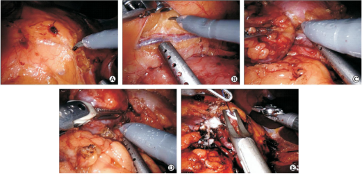 术中止血通过单极电剪的烧灼、止血棉的填充和缝合实现。在SH针上使用3-0倒刺缝合线止血并修补集合系统破损,适当填充止血棉,必要时应用止血剂。缝合线使用可吸收的缝合线夹固定,也可以用打结的方式进行固定(图2E)。对于肾实质缺损,在SH针上使用2-0倒刺缝线荷包式缝合。缝合完成后将肾脏自然伸展状态放置,并由助手移除bulldog肾动脉阻断夹。确认无持续性出血后,切除的肿瘤标本放入回收袋中,并通过皮肤12 mm切口处取出,视情况扩大切口长度。在肾周间隙放置一个引流管,缝合皮肤创口,完成手术。
