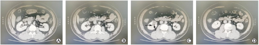 A:肿瘤上极平面;B:肿瘤位于左侧肾门前唇,呈囊实性;C:如箭头所示,肿瘤边缘与肾动静脉关系密切;D:肿瘤下极平面。