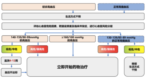 血压水平 140~159/90~99 mmHg 的高血压患者,心血管风险为高危和很高危者应立即启动降压药物治疗;低危和中危者可改善生活方式 4~12 周,如血压仍不达标,应尽早启动降压药物治疗;
