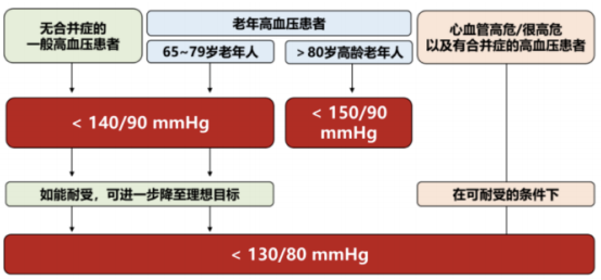 一般高血压患者应降至 < 140/90 mmHg;能耐受者和部分高危及以上的患者可进一步降至 < 130/80 mmHg。