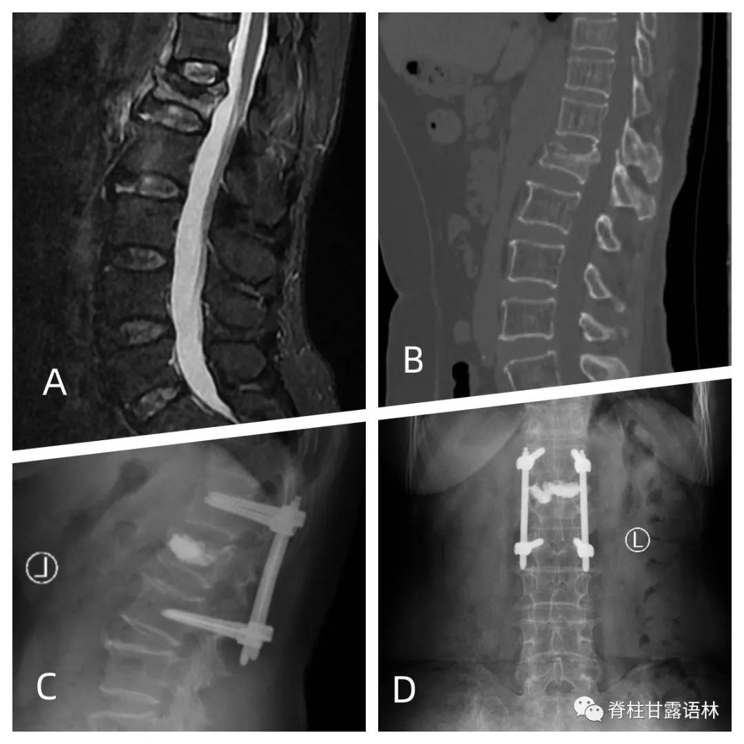 女,65岁,外伤致L1椎体爆裂骨折。A, 术前MRI显示L1椎体骨折,后方韧带复合体损伤,TLICS评分4分。B, 术前CT示L1骨折,椎体后上角轻度向后移位。C、D, 后路短节段经皮椎弓根螺钉固定+PVP术后3月复查正、侧位X线。当椎体爆裂骨折需要前柱支持时,后路固定联合椎体骨水泥增强已被使用。后路短节段椎弓根螺钉固定和PKP术可改善椎体高度的恢复,减少后凸畸形,并在最终随访时保持矫正效果。[18,25]