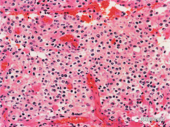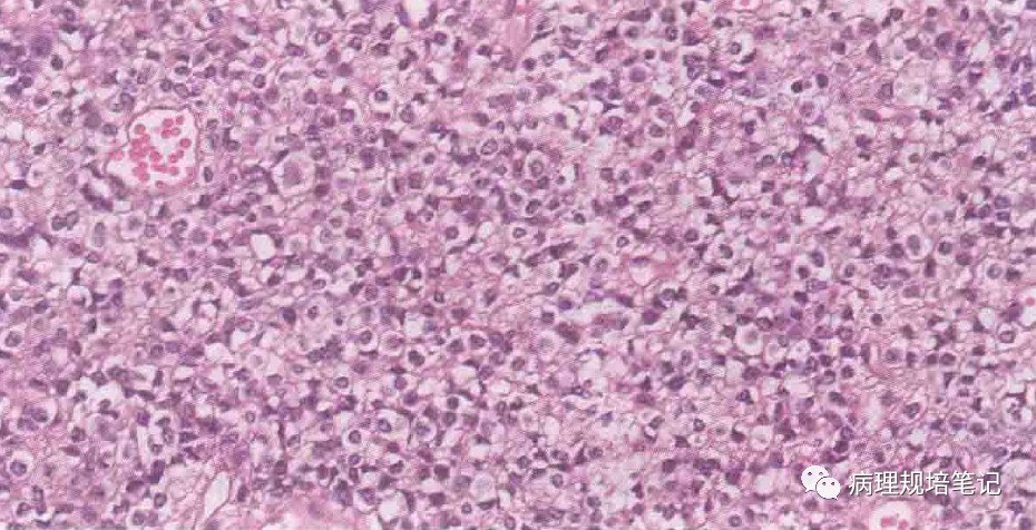 瘤细胞密度中等,大小一致,透亮(蜂窝状),见致密的分支状毛细血管网