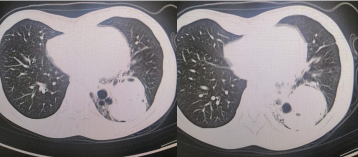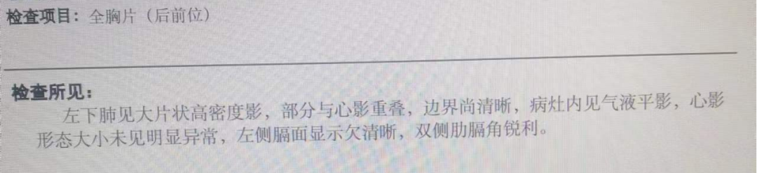 胸片:左下肺可见大片状高密度影,部分与心影重叠,病灶内见气液平影,左侧膈面显示欠清晰,双侧肋膈角锐利。
