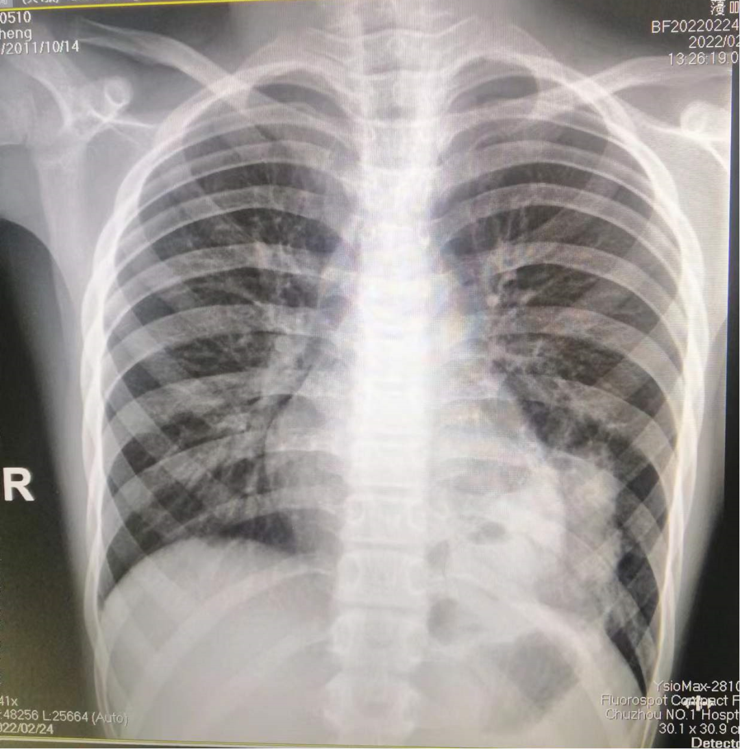 图1-2 患儿入院日胸片及检查所见