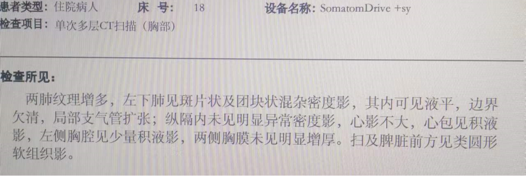 诊断意见:左下肺炎,左下肺脓肿待排,左侧胸腔少量积液,心包积液(如下图3和图4)。