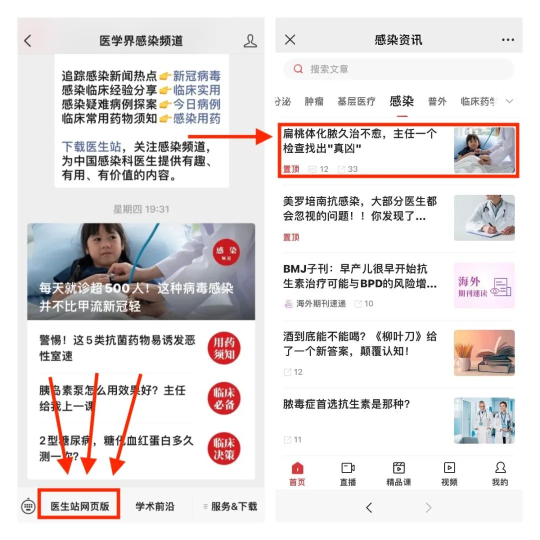 从“医学界感染频道”主页,点击下图所示“医生站网页版”菜单栏,即可立即进入,获得更多精彩内容!