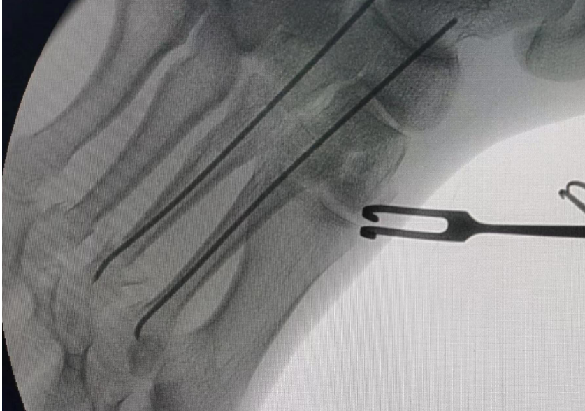 根据文献,建议对任何移位大于3-4 mm,角度大于10°的骨折进行复位。【3】首推小切口的手术方式,因为大切口往往会影响跖骨周围的血运以及较高的切口并发症。用髓内克氏针固定时目前认为的金标准,逆行髓内固定是治疗单纯性中间跖骨骨折最常见的方法。克氏针应通过跖骨头或相对应的的近端趾骨基部插入。