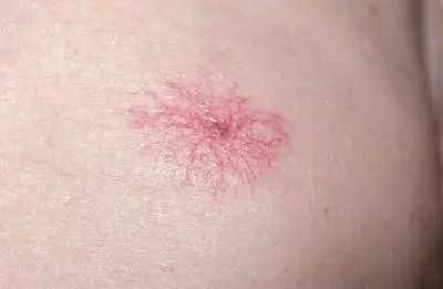 蜘蛛痣长的像蜘蛛,痣有一个中心点,可以凸起于皮肤表面,中心点的周围有一些辐射状的小血管,类似于蜘蛛的足,压迫中心点之后,蜘蛛痣会消失。蜘蛛痣从本质上来说是一种毛细血管扩张,皮肤的末段小动脉扩张。蜘蛛痣好发于颜面部,上胸部,肩背部。常见于肝硬化,慢性肝炎的患者,但是也可以见于健康人,例如小孩和孕妇。